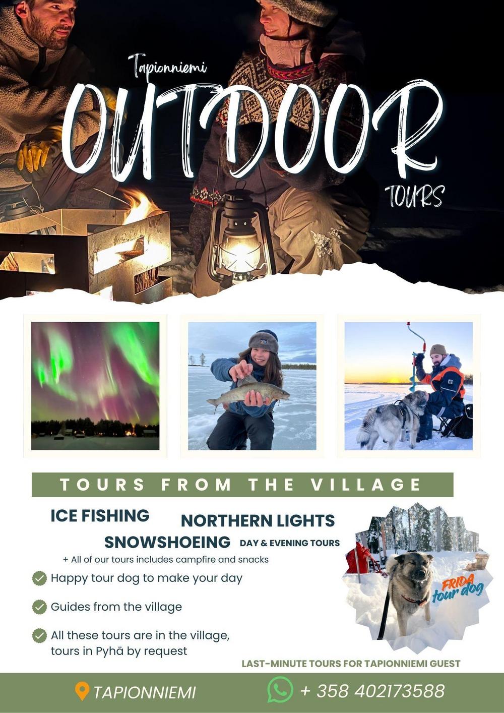 TOURS AND SERVICES IN TAPIONNIEMI OFFERS Backcountry Lapland and Lappi Creative. You can find the traditional reindeer farm visit, ice-fishing, snowshoeing and anything you could possibly wish for to make your holidays or stay memorable.